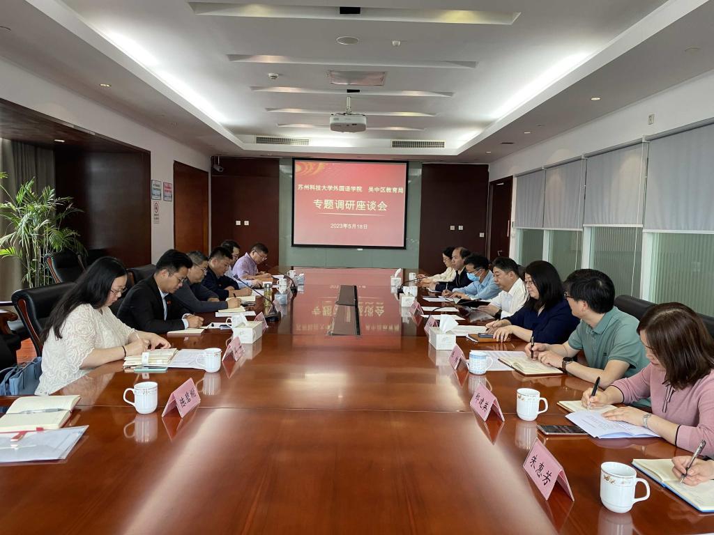 为进一步提升开云官方站在线登入人才培养质量,助力毕业生高质量就业,5月18日,校党委常委、纪委书记张德高携学生处和外语学院相关人员赴苏州市吴中区教育局开展访企拓岗促就业专项调研。吴中区委教育工委书记、教育局局长沈志枫、副局长张伟炜、教师发展中心主任刘伟、人事科科长张维、教师工作科副科长左兴及吴中区中小学教师代表等出席调研会。