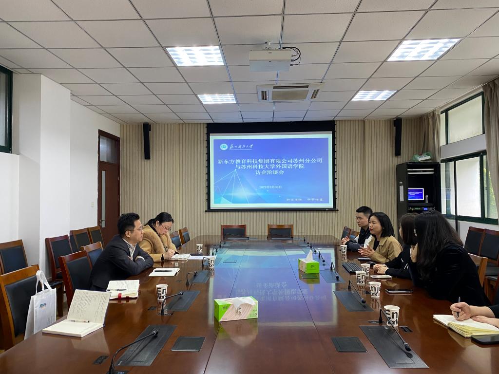 3月30日下午,新东方前途出国苏州分公司总经理傅羽一行五人来访开云官方站在线登入开展校企合作洽谈,学院党委书记姚之彦、副书记兼副院长周茹等参加了洽谈会。