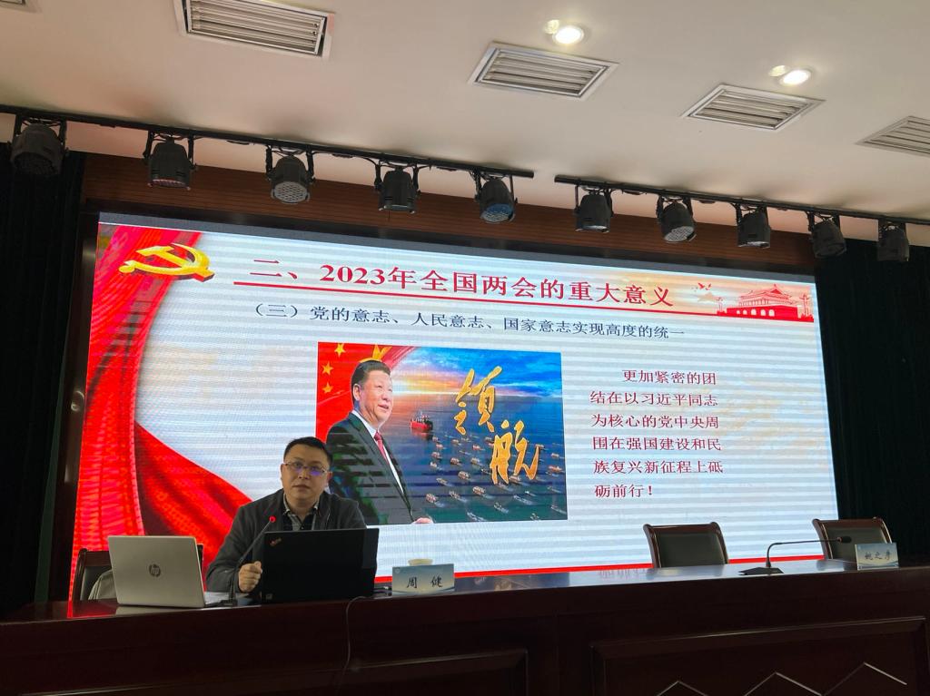 周健以《新时代 新征程 新伟业—学习贯彻全国两会精神》为题,介绍了全国两会的基本情况,主要从两会召开盛况,两会的重大意义、两会的主要内容三个方面,围绕习近平总书记参加江苏代表团审议期间的重要讲话和审议情况全面传达了全国两会的主要精神。讲座对学院教职工深刻把握全国两会精神实质,把两会精神转化为做好工作的强大动力,坚持守正创新、踔厉奋发起到了积极作用。