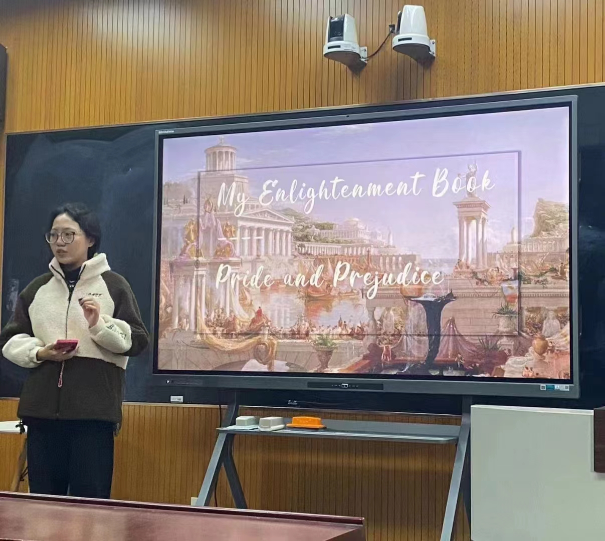同学们齐聚一堂,依次分享自己的阅读心得。20级英语专业王宇轩同学发表了自己对于《小妇人》书中多个女性角色的理解并与罗媛教授探讨了主人公“乔”的性格特点。23级英语1班的卢果同学从婚姻观切入,和大家分享了《傲慢与偏见》中婚姻观念的阶级性。同样来自23级英语1班的孙可雨同学从凝视理论的角度分析了夏洛特·勃朗蒂小说《维莱特》中体现的女性生存境遇。同学们在交流中互相学习,深入理解了文学的价值和意义。