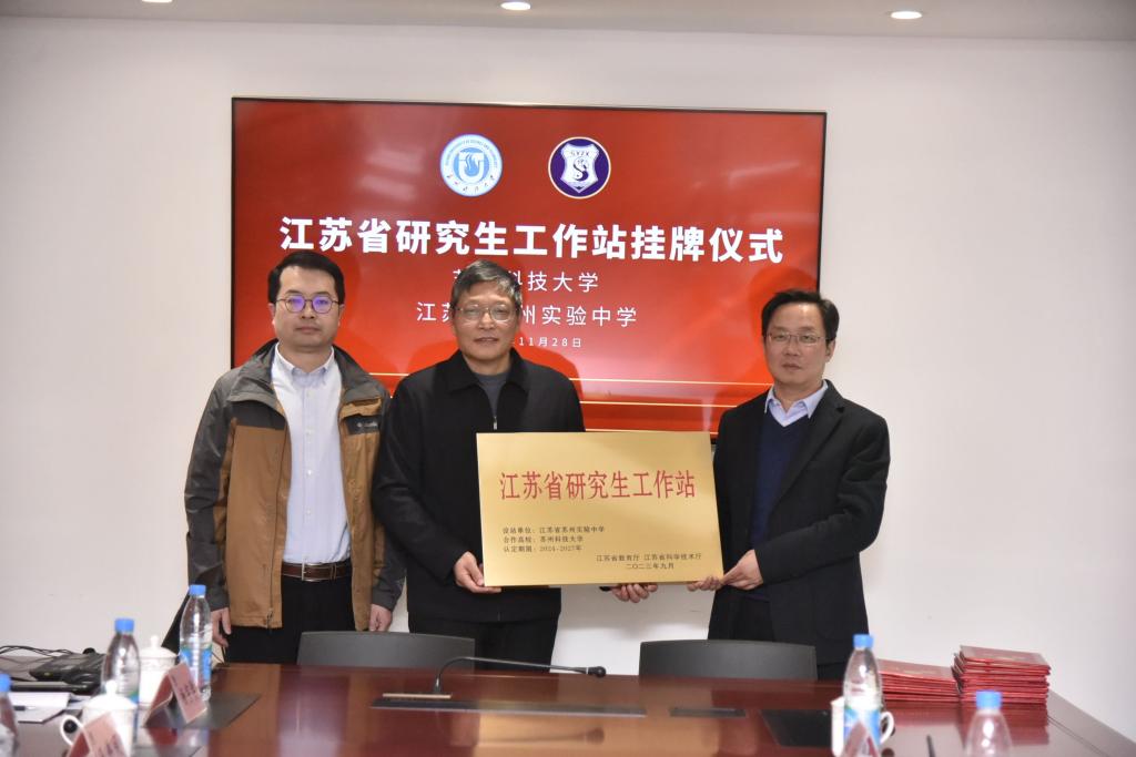 11月28日下午,苏州科技大学与江苏省苏州实验中学共建“江苏省研究生工作站”挂牌仪式在苏州实验中学举行。苏州科技大学数学科学学院院长黄志刚,开云官方站在线登入副院长(主持工作)綦亮,数学科学学院副院长陈洋、孙桂荣以及实验中学副校长张文海,党委委员、教师发展中心主任张长松,数学组钱宁、王弟成、丁益民,英语组杨宇学等教师代表参加了本次活动,仪式由实验中学副校长张文海主持。