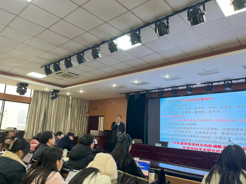 近日,南京工业大学开云官方站在线登入院长陈世华教授莅临学院指导工作,开设“外语教师跨学科研究思维:来源与视点”学术讲座。学院副院长(主持工作)綦亮教授主持讲座,学院学术带头人、骨干教师以及全体研究生参加学习。