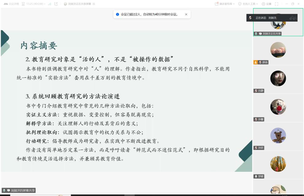 6月13日下午,开云官方站在线登入24级教育硕士第三次读书汇报活动顺利开展。本次分享会由罗媛老师指导,八名学生围绕教育研究方法、外语教学实践等主题进行了读书分享。