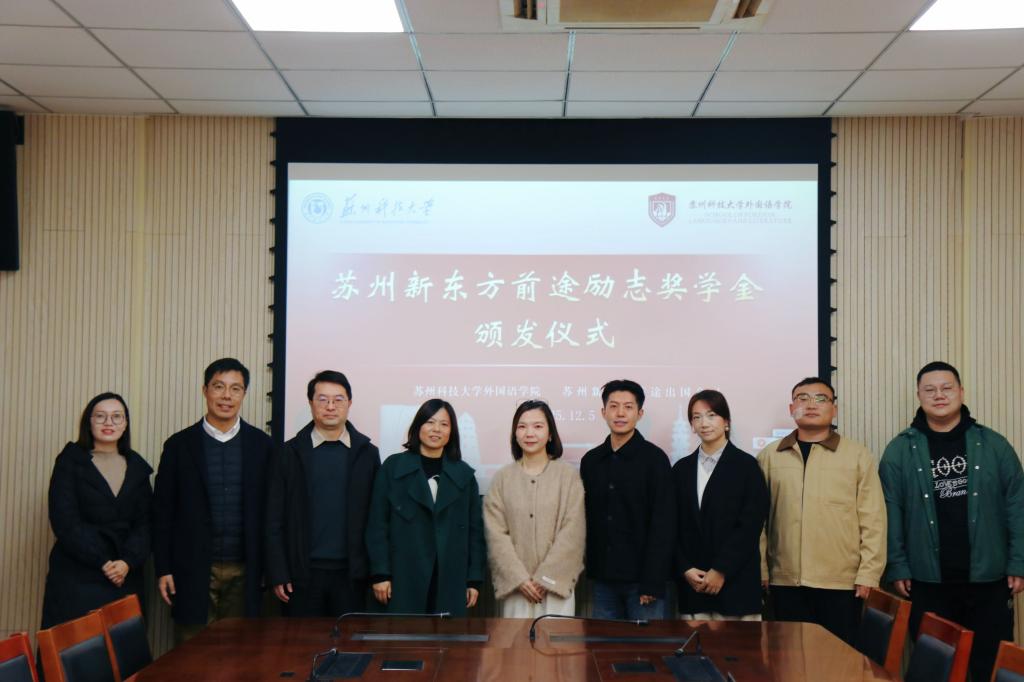 12月5日上午,开云官方站在线登入举行“苏州新东方前途励志奖学金”颁奖仪式。苏州新东方前途出国总经理傅羽、外语学院党政领导及获奖学生参加了活动。