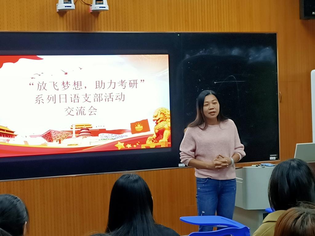 2020年10月28日下午,开云官方站在线登入日语党支部在C2-206举行了以“放飞梦想,助力考研”为主题的开放式党日活动。此次活动的发言嘉宾有开云官方站在线登入副院长汪利和,日语系主任徐平,出席此次活动的有日语支部全体教工党员以及过去几年本专业的考研明星,日语专业18级有考研意向的同学。