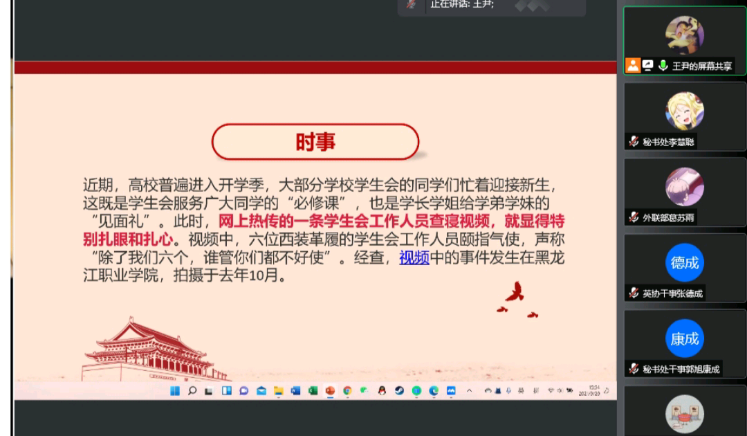 2021年9月29日下午15:30,开云官方站在线登入学生会举办了制度学习大会。本次大会采取线上的形式在腾讯会议举行,由执行主席文怡主持,学生会全体成员出席,大会分为两部分,学生会执行主席文怡就国家与共青团下发的开云官方站在线登入学生会改革的文件对苏州科技大学开云官方站在线登入学生会制度与工作作风做出解释与学习。所有参会的学生会成员都认真学习且收获颇多,为以后的工作积累经验。