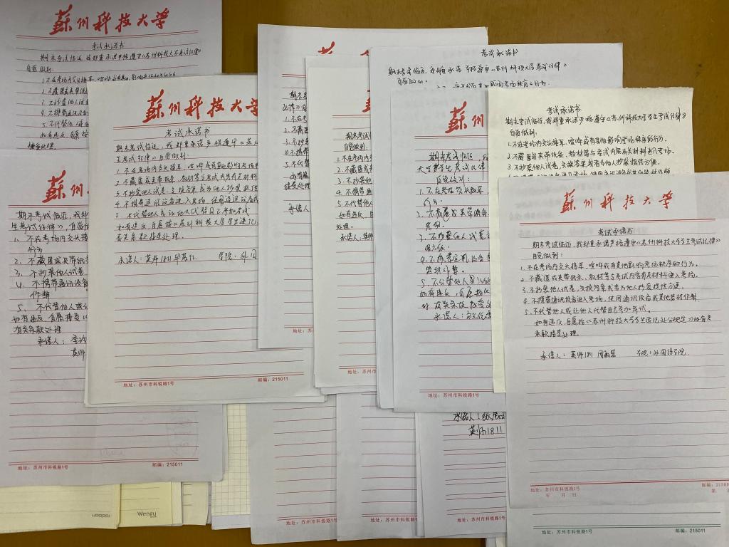 会议伊始,陈老师播放了诚信考试宣传片,并集中学习了2020年《学生手册》考试相关的条例和规定,然后通过学校出现的真实案例给学生们开展了警示教育。最后,陈老师带领2018级全体学生进行了诚信宣誓仪式并要求全体同学手抄《诚信考试承诺书》。