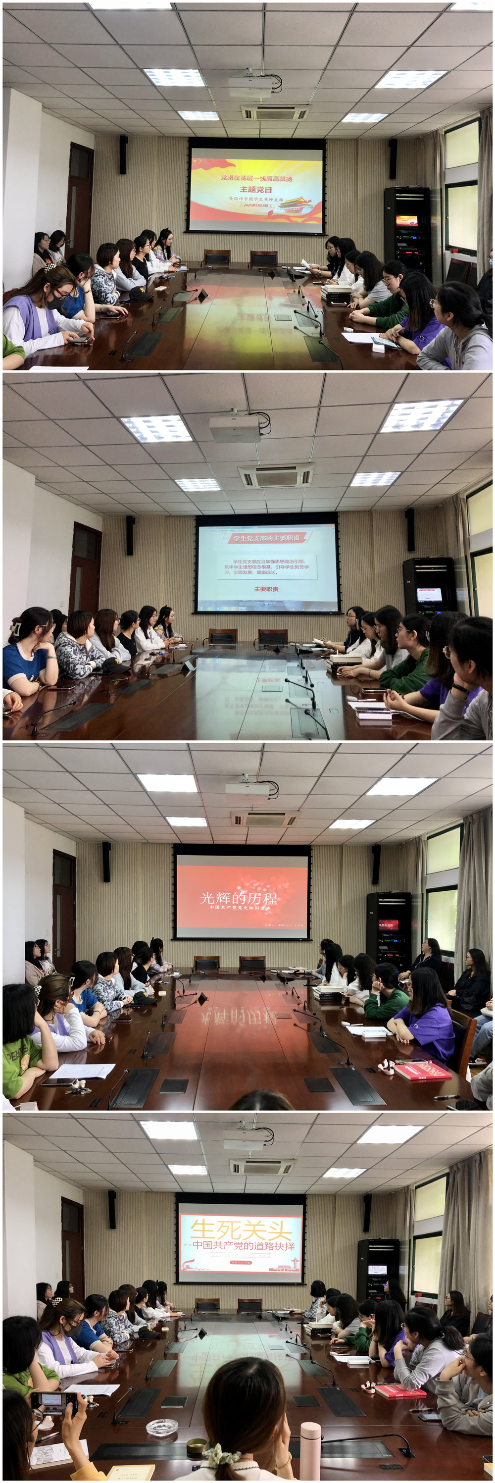 活动伊始,党支部书记周茹老师带领大家全体党员学习了《中国共产党普通高等学校基层组织工作条例》,分别从条例修订的背景、过程、意义和主要修订的内容出发,强调高校党组织应当把理想信念教育放在首位,把立德树人作为根本任务,加强意识形态阵地管理。随后,学生党员王宇琴、倪蔚结合党史教育,分享了最近阅读的两本书籍《光辉的历程——中国共产党党史知识读本》和《生死关头——中国共产党的道路抉择》。通过两位同学的分享,全体党员深刻感悟到习近平总书记说的“中国共产党的历史是中国近现代以来历史最为可歌可泣的篇章,学习中国近现代史要特别注意学习中国共产党的历史”含义。