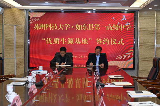 吴军对我校到访人员表示热烈欢迎,对我校选择如东县第一高级中学作为“优质生源基地”表示真挚感谢。他介绍了如东县第一高级中学的办学特点、生源质量、师资力量等情况,并表示期望以此次合作为契机,共创发展机遇,实现互惠双赢,搭建新的桥梁,带动高校与中学共同发展。姚之彦介绍了我校的办学历史、专业与学科特色、师资力量、人才培养等情况,对如东县第一高级中学向我校输送优质生源表示感谢,希望双方进一步加强合作,共促发展;凌飞介绍了我校本科生招生政策和在南通的招生情况。随后,双方共同观看了苏州科技大学宣传片。活动最后,双方代表签署了《开云官方站在线登入建立“苏州科技大学优质生源基地”的合作协议》,并举行了优质生源基地授牌仪式。