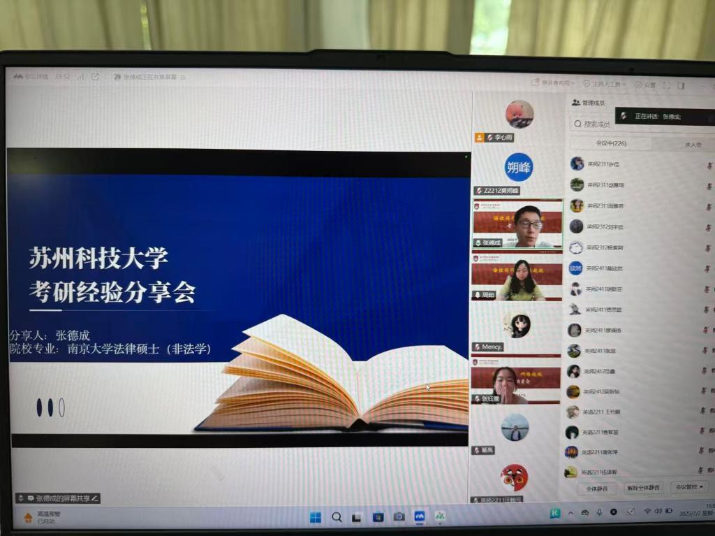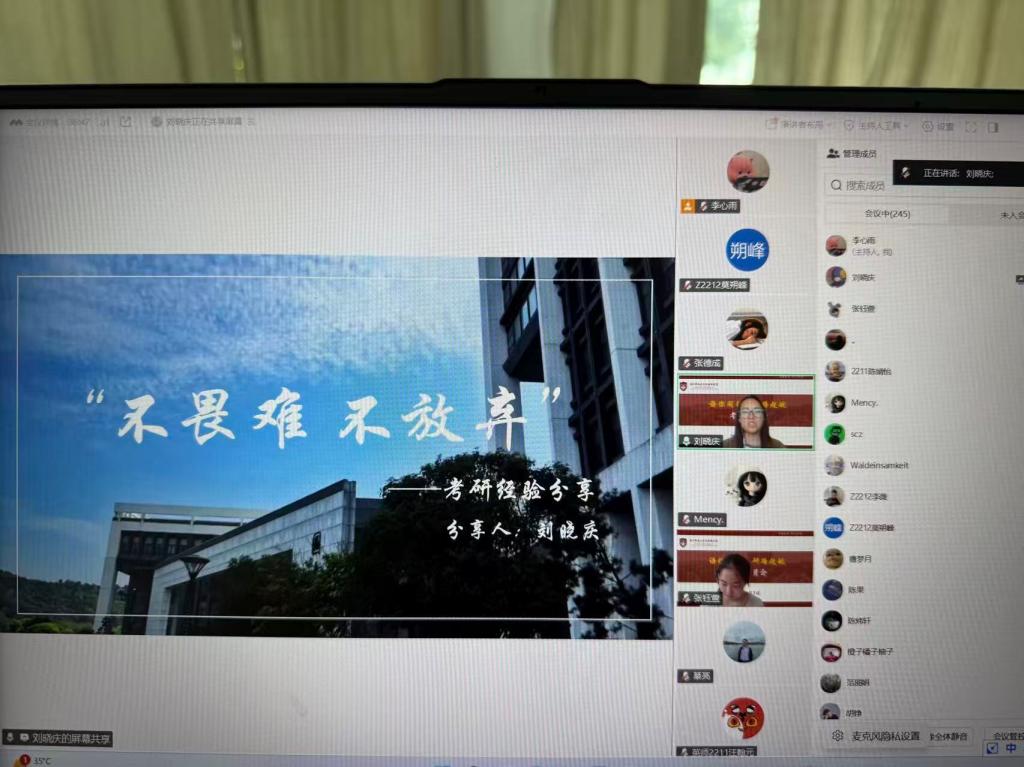 2025年7月7日下午,开云官方站在线登入通过腾讯会议举办考研动员会暨经验分享会,旨在为学子明确备考方向、优化复习策略。学院党委副书记兼副院长周茹、辅导员李心雨主持会议,两百余名学子云端参与。