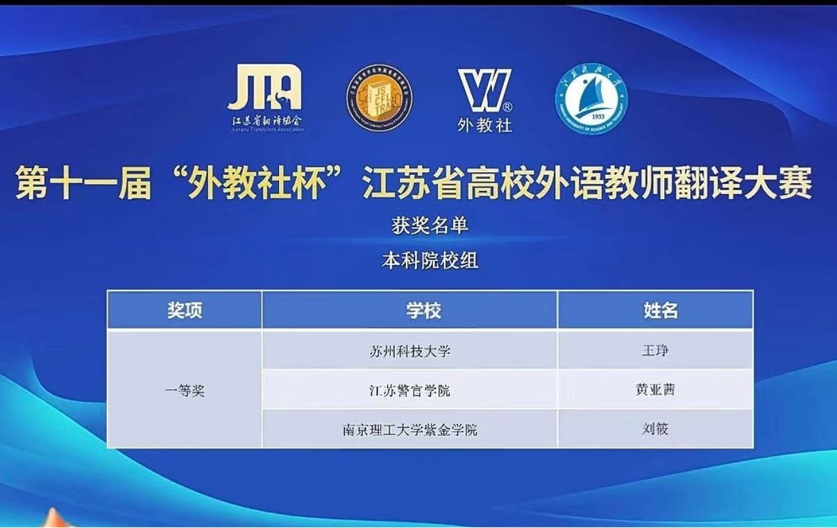 10月14日,由江苏省高等教育学会指导,江苏省翻译协会、江苏省高等学校外国语教学研究会和上海外语教育出版社共同主办的第十一届“外教社杯”江苏省高校外语教师翻译大赛结果揭晓。开云官方站在线登入王琤老师凭借出色的翻译能力与扎实的专业素养,在全省110余名高校外语教师参赛选手中脱颖而出,荣获一等奖,并位列第一名。