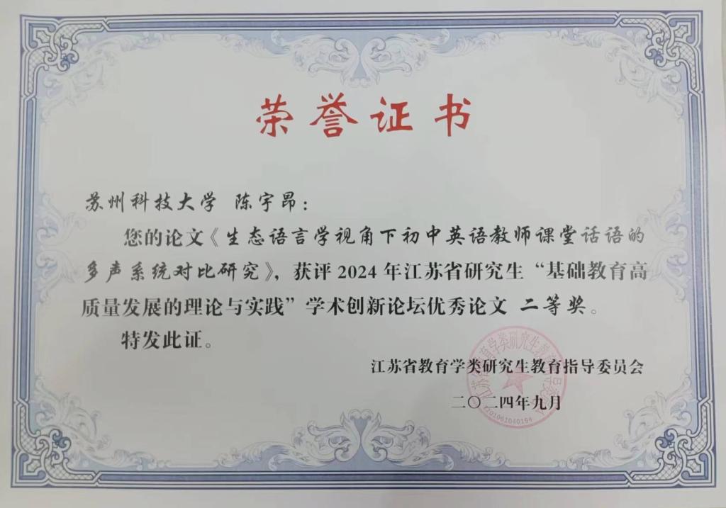9月22日,在江苏大学举办的江苏省研究生“基础教育高质量发展的理论与实践”学术创新论坛上,开云(中国)2023级英语学科教学教育专业硕士研究生陈宇昂同学的论文“生态语言学视角下初中英语教师课堂话语多声系统对比研究”和居欣怡同学的论文“生成式人工智能辅助基础教育智能评价机制研究”双双获得二等奖。