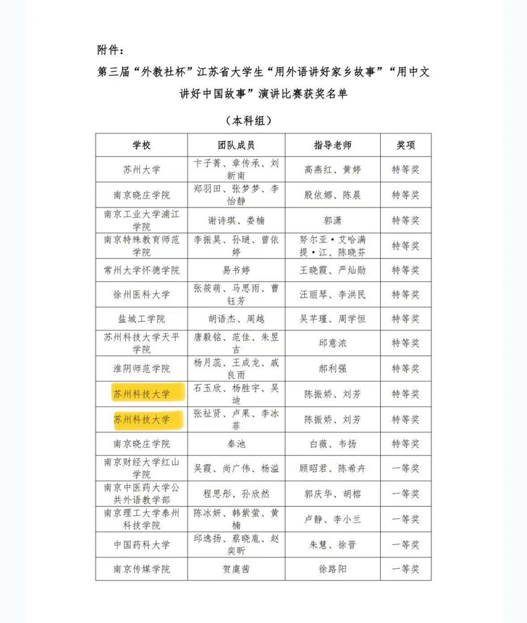 近日,由江苏省高等教育学会指导、江苏省高等学校外国语教学研究会、“学习强国”江苏学习平台、上海外语教育出版社主办,江苏经贸职业技术学院承办的第三届“外教社杯”江苏省大学生“用外语讲好家乡故事”“用中文讲好中国故事”演讲比赛决赛顺利举行。该项比赛被江苏省高等教育学会认定为全省普通高校本专科生学科竞赛省级赛事培育项目。